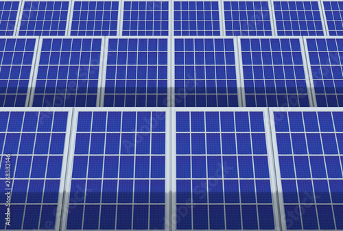 3d rendering. electric energy generator system, solar cells panels field farm industry background.