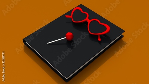 3D rendering illustration of heart shaped sunglasses and lollipop on a closed book