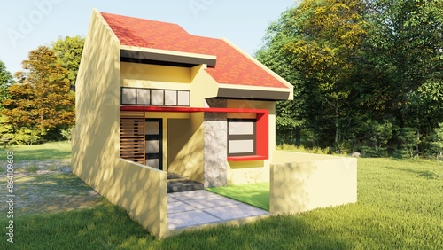 3D Rendering Illustrations of a Small Red-Roofed House in Cream Paint in the Woods Basked in the Sun - House Exterior