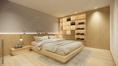 3d rendering. Interior house modern open living space with modern minimal style apartment residence.Home decoration interior design idea.Bedroom wood material.