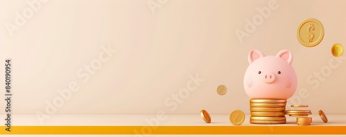 3D Rendering of a Cute Pink Piggy Bank with Stacked Coins and Flying Gold Coin on White Background, Symbolizing Financial Savings, Business Concepts, and Rainy Day Fund Ideas