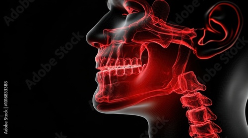 3D rendering of a human head with the jaw highlighted in red, representing jaw pain or temporomandibular joint disorder (TMJ).