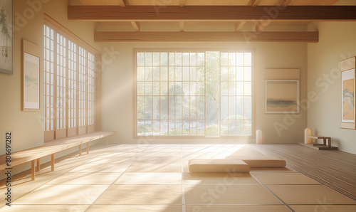 3D rendering of a Japanese interior design living room with wooden windows and tatami mats on the floor