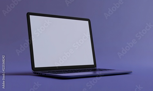 3D rendering of a modern laptop with a blank white screen on a blue and purple background, captured with a 24mm f/8 lens,