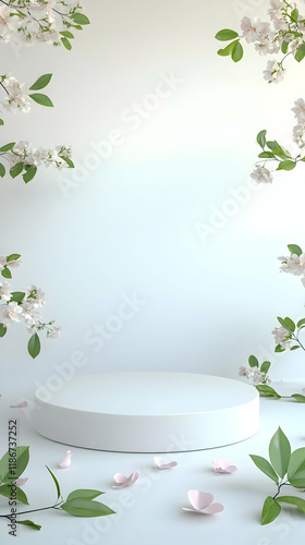 3D rendering of a single circular podium surrounded by floral elements for natural skincare commercials