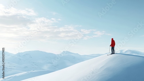 3D rendering of A skier at the top of a snow hill and looking at the landscape view in winter. Template concept with copy space.
