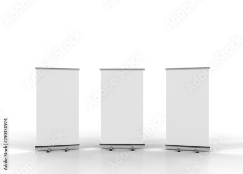 3D rendering of blank vertical rollup (empty billboard advertisement) isolated on white background. Empty mockup template