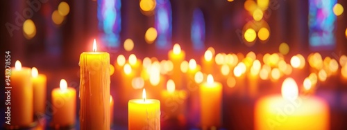 3D rendering of close up candles in a historic church with a blurred background