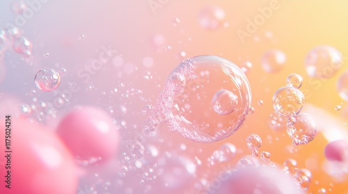 3D rendering of colorful soap bubbles in pink and blue gradient on a pastel background, with close-up macro details and a dreamy minimalist atmosphere, featuring free space for text.