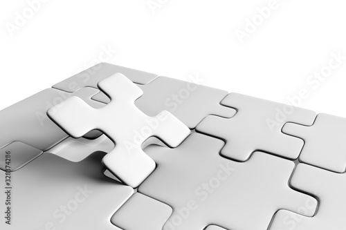 3d rendering of jigsaw puzzle concept. Blank gray unfinished puzzles game mockup, connecting together on white background. Jigsaw pieces merging, design mock up. Big desktop toy template. Copy space