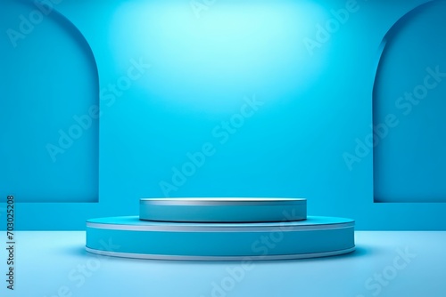 3d rendering of minimal geometric forms. Glossy luxury podium for your design in blue and green colors, Minimal scene with podium and abstract background. Pastel blue