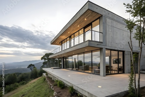 3d rendering of modern cozy house by the river with garage for sale or rent with beautiful mountains on background. Clear summer evening with blue sky. Cozy warm light from window.