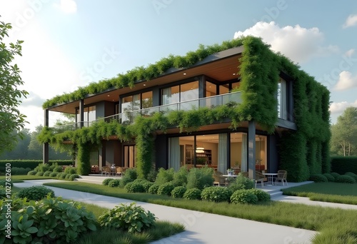 3d rendering of modern cozy house by the river with garage for sale or rent with beautiful mountains on background. Clear sunny summer day with blue sky.