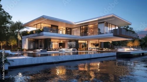 3d rendering of modern house by the river at morning, house, luxury, villa, modern, architecture, building, exterior, residential, property, designer