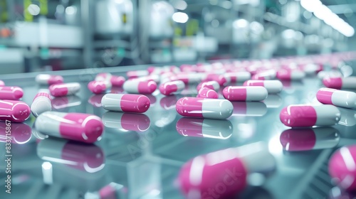3d rendering of pink and white pills in the middle on table with blurred background of medical laboratory or factory, industry concept