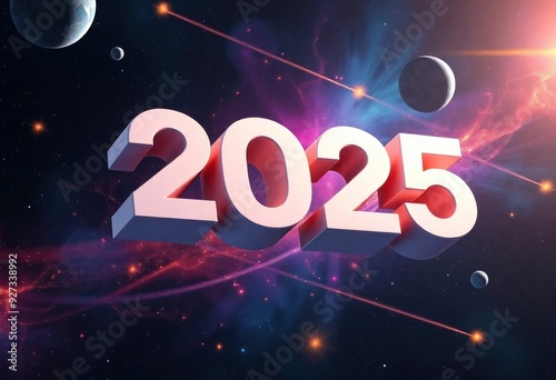 3D rendering of the text '2025' in an abstract space scene, surrounded by stars and planets, with swirling colors and cosmic elements., ai