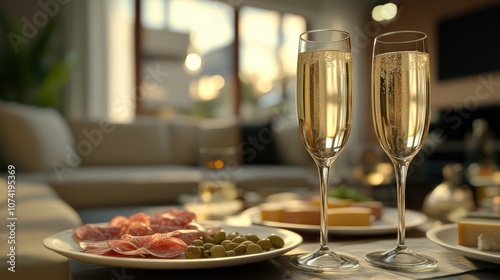 3D rendering of two glasses of chilled champagne accompanied by plates of assorted snacks on a table featuring white plates filled with ham salami capers olives and cheese in a cozy living room se