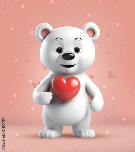 3D Rendering Polar Bear Holding Heart Shape Isolated On Red Background, Valentine's Day. Generative AI