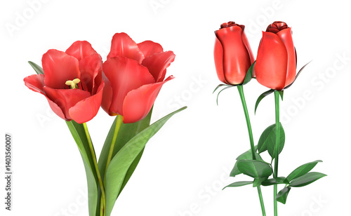 3d rendering red tulip and red roses flowers isolated on transparent background, PNG file add