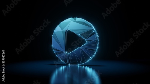 3d rendering wireframe neon glowing symbol of play circle on black background with reflection