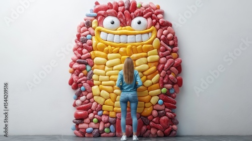 3D rendring Giant Candy Monster: Creative Visual Art Featuring Colorful Sweets and a Person AI Generative