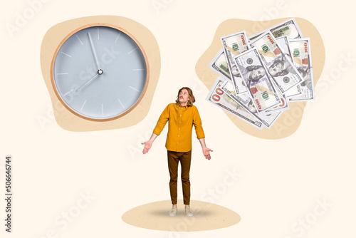 3d retro abstract creative artwork template collage of doubtful man choosing money or time isolated beige color background