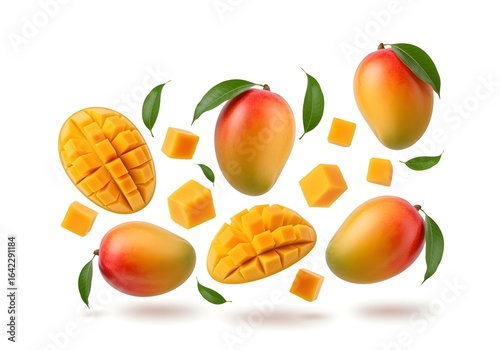 3d ripe mango icon whole and sliced with cubes and green leaves isolated on white background tropical fruit neurodiversity autism ADHD sensory processing awareness inclusion