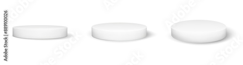 3d round product podium. Circle platform angle view isolated vector template. Circular base set for showcase studio. Cheese cake premium display stand mockup. Exhibition advertising with white plate