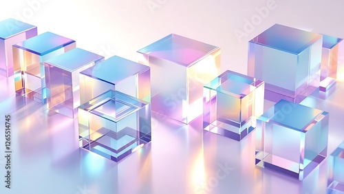 3d set of crystal light holographic glass cube render icons. Abstract geometric transparent block shapes with hologram gradient and dispersion effect. Isolated glossy square objects. 3D illustration