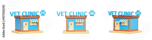 3d set of vet clinic building exterior front and side view. Animal hospital, veterinary laboratory, cartoon blue office facade. Medical health care facility, render city architecture