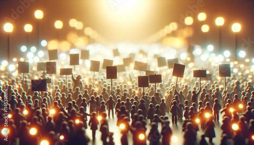 3D Soft focus rally crowd with glowing signs concept as Wide shot of a blurred rally crowd holding glowing signs. Camera slowly pans across the scene capturing the energy and scale of the gathering. B