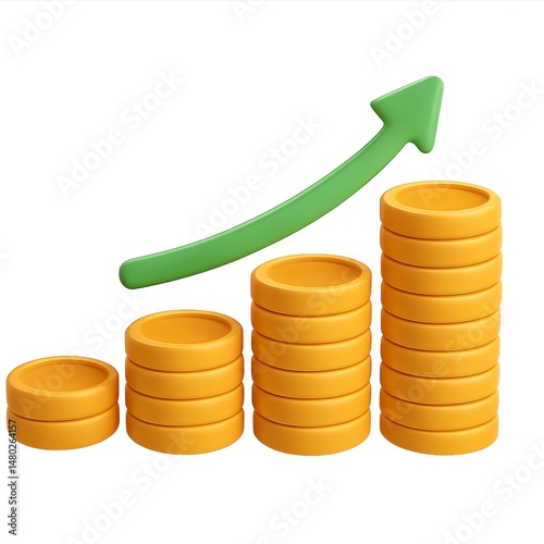 3D Stack of Gold Coins with an Upward Arrow Showing Growth Trend