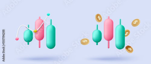 3D stock trading graph report for statistic market in bubble icon. Sell and buy money cash and exchange with finance business, analyzing investment. 3d bank trading icon vector render illustration
