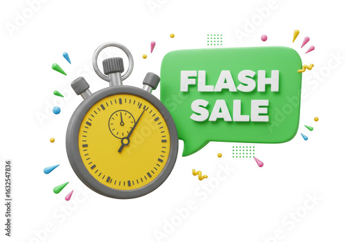 3d stopwatch and green speech bubble announcing flash sale with colorful confetti isolated on transparent background