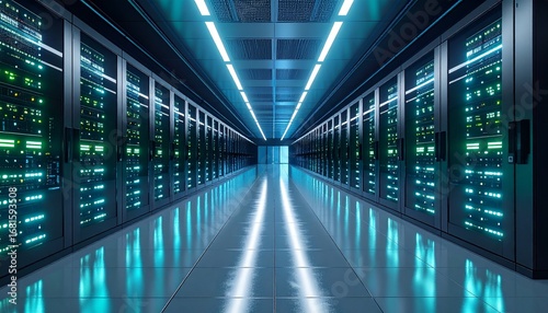 3D ultra-realistic wide-angle render of futuristic data center with glowing blue and green server racks, polished reflective floors, and advanced high-tech environment.