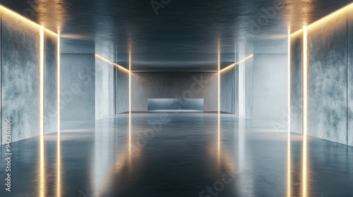 3D-rendered futuristic room with polished cement floors and glowing light accents, creating a sleek, high-tech environment for product displays or modern interior designs.