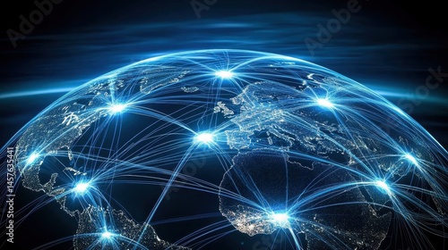 3D-rendered globe with bright blue network links connecting major cities, symbolizing worldwide internet connectivity, digital communication, and global business, isolated on dark gradient background.