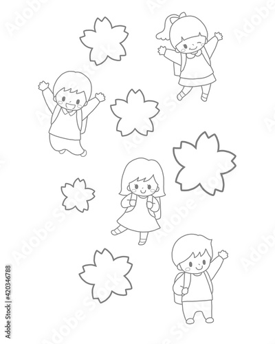 かわいい小学生4人と桜の花の春の入学進級手描き風線画イラスト