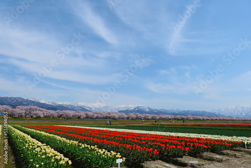 春の四重奏として知られる舟川べり桜並木。朝日、富山、日本。4月中旬。