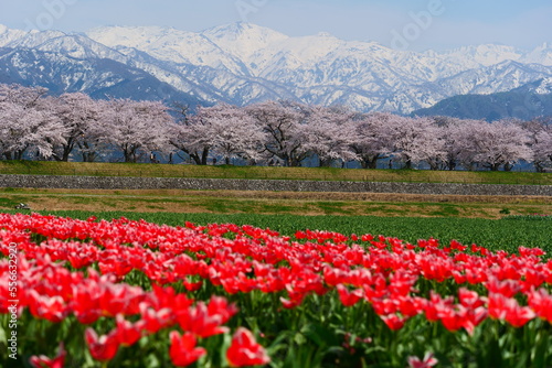 春の四重奏として知られる舟川べり桜並木。朝日、富山、日本。4月中旬。
