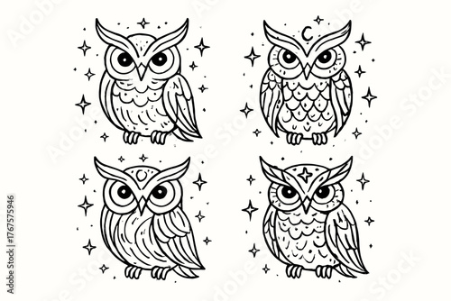 4 outline owls mystical style with starry background flat vector illustration style isolated on white background
