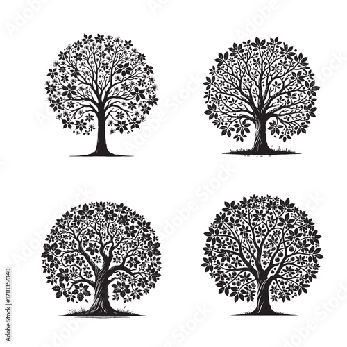4 set of black Detailed Silhouette of the Mockernut Hickory Tree - High-Quality Vector Art