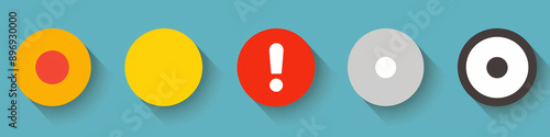 4 simple vector icons, an exclamation mark in a white circle with a black border and shadow, two different colors, one red and the other yellow, flat design, simple shapes, simple lines,