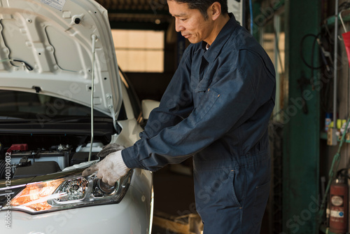 ヘッドライトの点検をする40代男性整備士