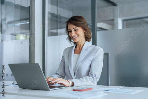 40s European aged analyst woman using computer technology for work online. Mature professional specialist latin hispanic business lady working on laptop pc sitting at desk in modern office. Copy space