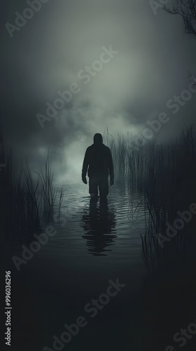 44. A mysterious figure emerging from a foggy swamp, shrouded in darkness and intrigue
