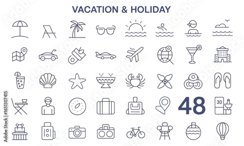 48 editable stroke travel and vacation icons including beach, palm tree, luggage, airplane, hotel, map, camera, and holiday essentials