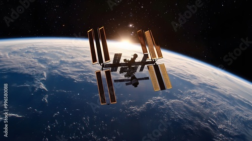 5. A serene scene of a space station docking with a small shuttle in low Earth orbit