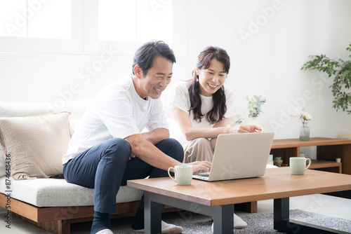 明るい綺麗なリビングでパソコンを見ながら話し合う50代夫婦 不動産や旅行を探すイメージ広角