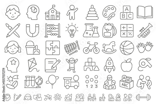 50 Early Learning Line Icons: Children Education & Kids Activity Editable